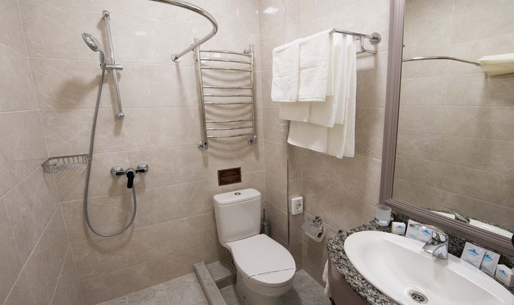 В номере: кровать двуспальная, стол, столик туалетный, стулья, гладильная доска, набор посуды, сейф, сплит-система, телевизор, утюг, холодильник, электрочайник